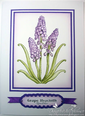 The basic card for this one is even simpler, just a basic A5, but I always think that matting and layering brings an elegant shift to any card and the technique this time is watercolour using Ranger Distress Inks - specifically Dusty Concorde and Forest Moss. You could also use watercolour pens for this technique but, for me, nothing reacts with water better than Sir Tim's Distress Inks! This is another Woodware stamp called 'Grape Hyacinth' (never refrain from stating the obvious, Diane!!) It's another design from the talented Jane Gill and being in the style of botanical illustration, I thought that this one was perfect for the watercolour technique. The plant label at the bottom is cut from another of the newer Spellbinders, this time it's Enchanted Labels 28. This is just the smallest die in the set and is fairly plain but the larger ones are just wonderful.